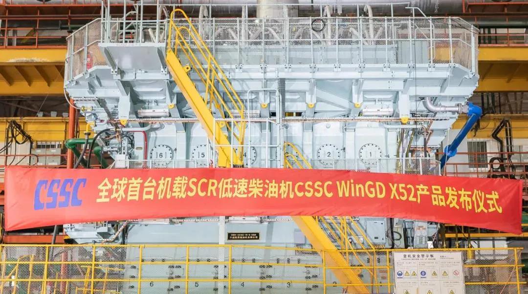 2021年7月22日,由中國船舶集團旗下中船動力集團自主研發、大連船柴建造的全球首臺機載SCR(選擇性催化還原系統)船用低速機CSSC WinGD X52正式向全球發布。