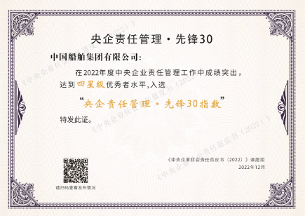 2022年12月20日,由國務院國資委社會責任局主辦、中國社會責任百人論壇承辦的“新征程 新責任——《中央企業社會責任藍皮書(2022)》《國資國企社會責任藍皮書(2022)》發布活動”在京舉行?;顒右浴霸贫藭h”的方式舉辦,發布了“央企責任管理 · 先鋒30指數”,中國船舶集團入選該指數。