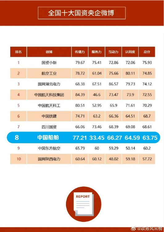 1月31日,由微博出品,人民網(wǎng)輿情數(shù)據(jù)中心、人民網(wǎng)數(shù)據(jù)研究院提供學(xué)術(shù)支持的“2023年度政務(wù)微博影響力報(bào)告”發(fā)布。“中國(guó)船舶”微博登上“全國(guó)十大國(guó)資央企微博”榜單,這是“中國(guó)船舶”微博第三次進(jìn)入“全國(guó)十大國(guó)資央企微博”排行榜。