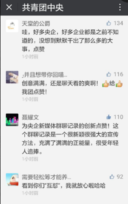 中國人民大學新聞學院教授宋建武認為,“央企新媒體群聊記錄”的走紅,是因為真實、接地氣、參與感強,“每個人都有群聊的經歷,這種方式使人們感覺親切、有趣”,公眾需要和喜聞樂見才是它能夠吸引人、感染人的原因。