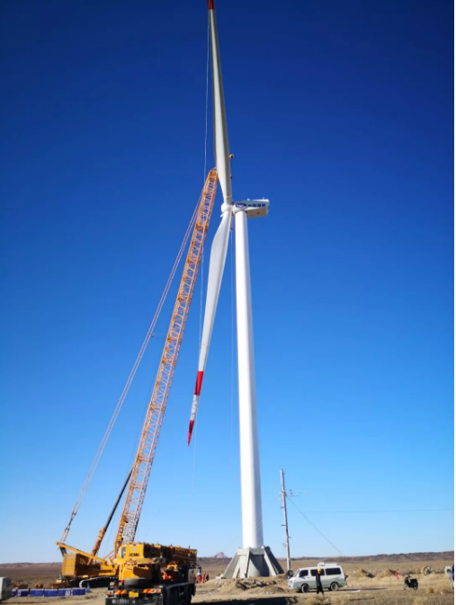 ????近日,中國海裝鑫垣新疆昌吉奇臺北塔山99兆瓦風電項目首臺H136-2.2兆瓦機組完成吊裝。