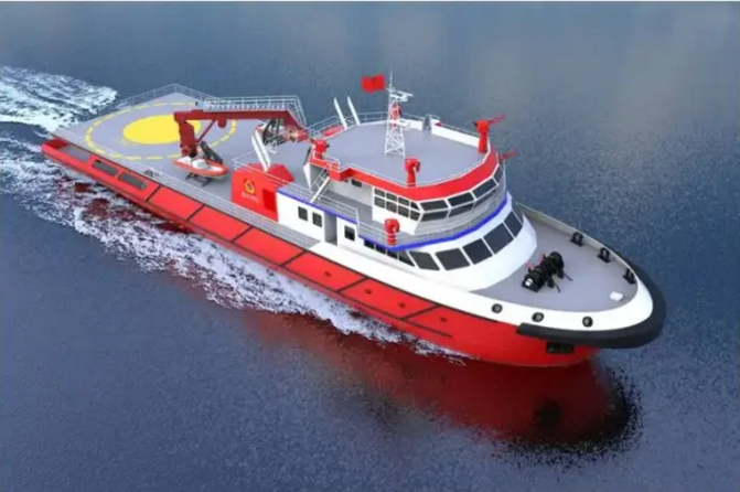 綜合救援消防船總長60米,配備電力推進(jìn)系統(tǒng)和直升機(jī)平臺,對外消防能力達(dá)到內(nèi)河第3類消防等級。