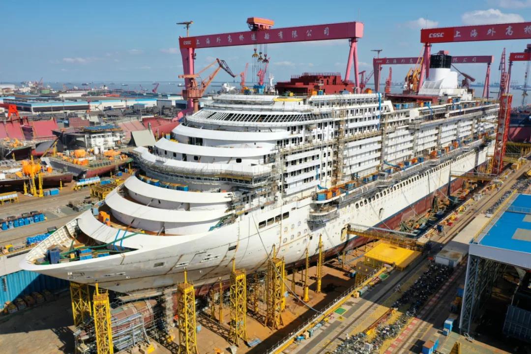 9月17日,中國船舶集團旗下外高橋造船建造的國產首制大型郵輪最后一個總段L4吊裝搭載,標志著全船總段制作暨搭載順利完工。