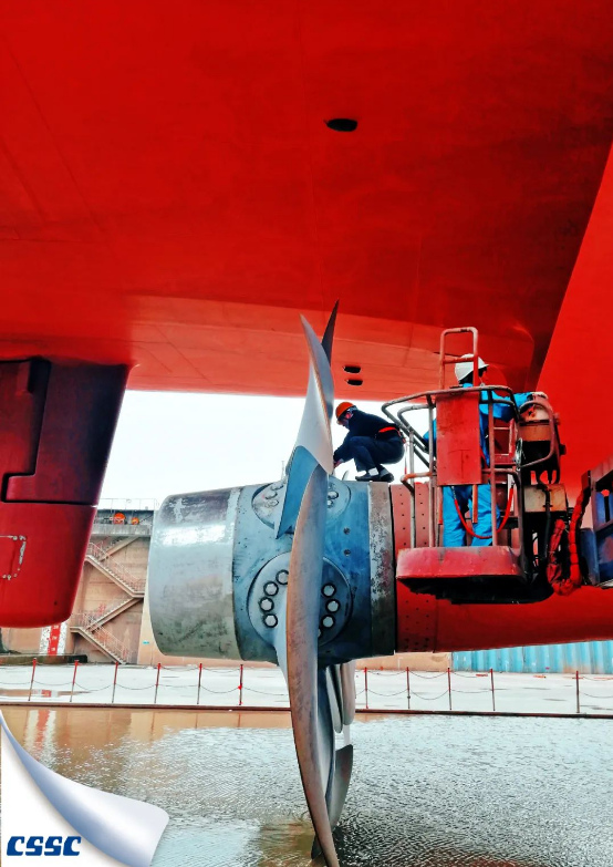 中午,船廠的工人們正在為設備最后調試,龐大的紅色船身和渺小的作業人員,形成了鮮明有趣的對比,正是有千千萬萬小小的我,成就了大大的深藍夢。
