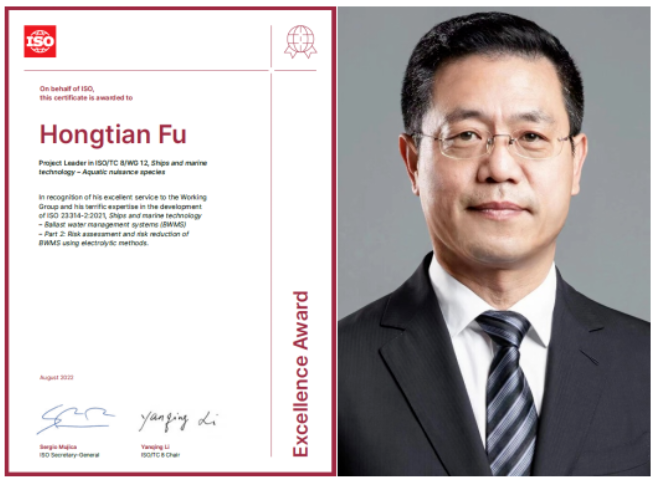 ISO卓越貢獻獎旨在表彰在上一年度ISO國際標準制修訂工作中作出突出貢獻的專家、項目負責人或工作組召集人。此次頒獎表彰了付洪田在ISO 23314-2:2021《船舶與海洋技術—壓載水管理系統—電解法壓載水管理系統的風險評估與風險降低》國際標準研制作出的貢獻。