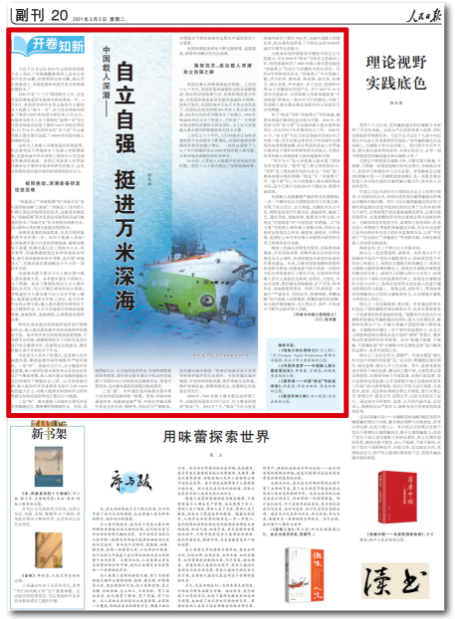 3月2日,人民日報 “開卷知新” 專欄刊發“蛟龍號”總設計師中國工程院院士中國船舶集團七〇二所研究員徐芑南文章《中國載人深潛——自立自強 挺進萬米深海》。