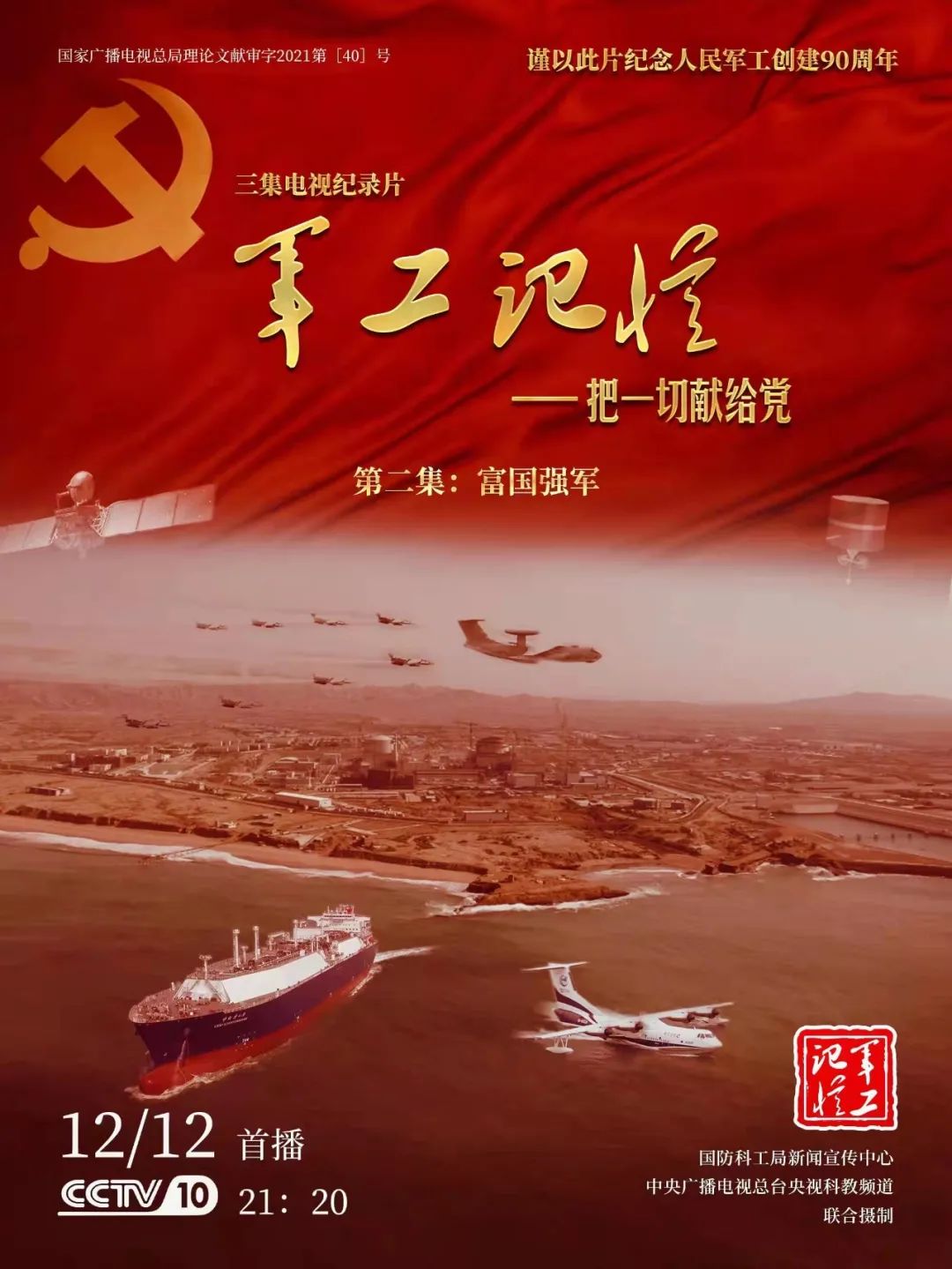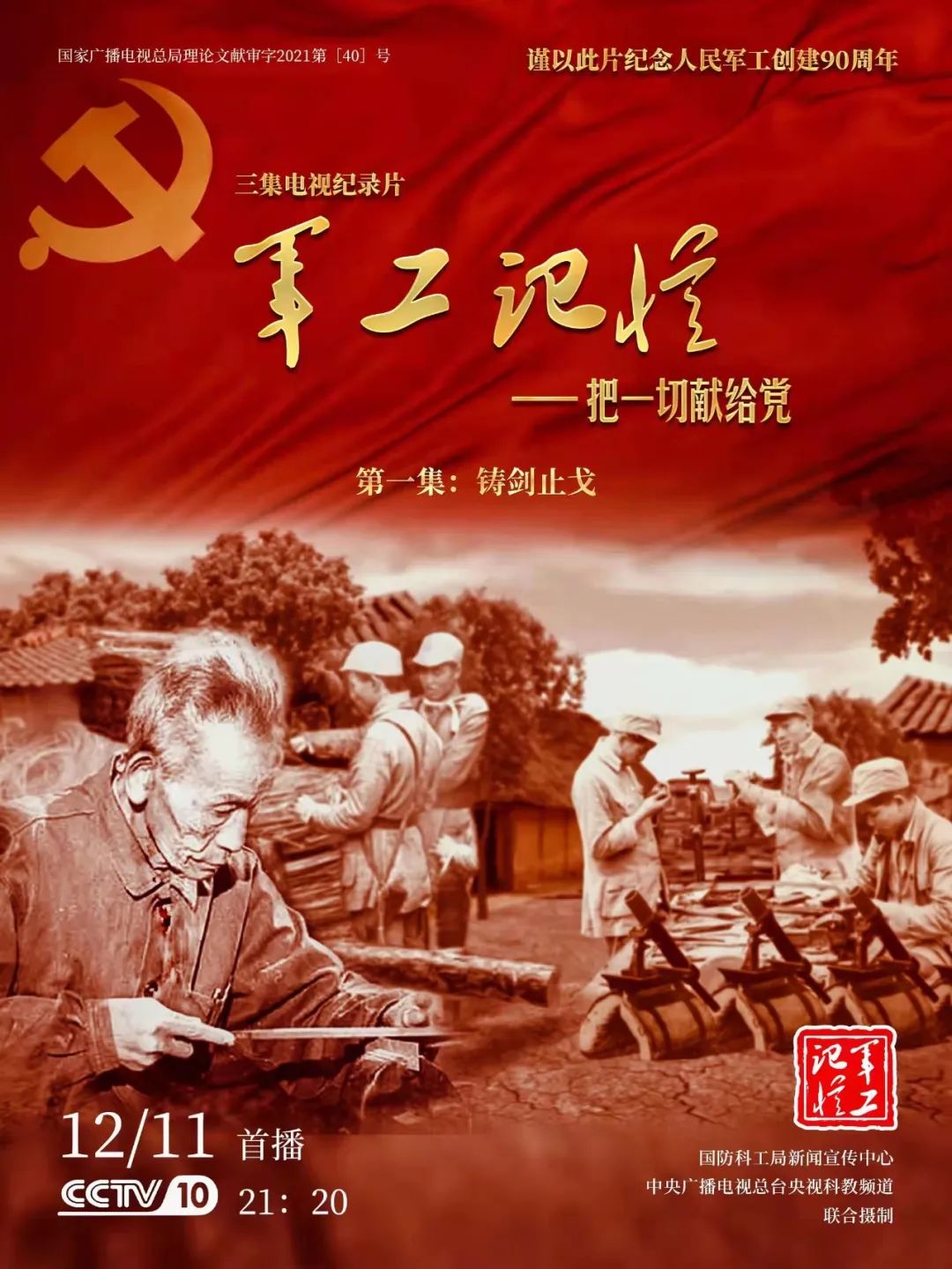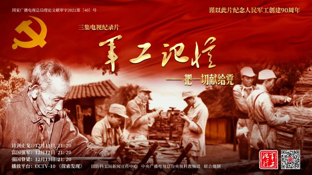 為慶祝中國共產黨成立100周年,紀念黨領導下的人民軍工創(chuàng)建90周年,由國防科工局指導,國防科工局新聞宣傳中心聯(lián)合中央廣播電視總臺社教節(jié)目中心攝制,各軍工集團大力支持的3集重大理論文獻電視紀錄片《軍工記憶——把一切獻給黨》,將于12月11日21:20在央視科教頻道(CCTV-10)《探索發(fā)現(xiàn)》欄目首播,連續(xù)播出3天。該紀錄片旨在向建黨百年獻禮,向人民軍工90周年致敬,向全社會弘揚軍工精神傳遞軍工文化,激勵國防科技工業(yè)戰(zhàn)線廣大干部職工不忘初心、接續(xù)奮斗,為實現(xiàn)強軍強國夢想貢獻力量。