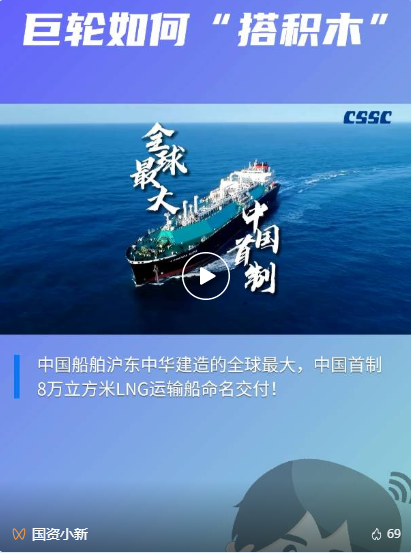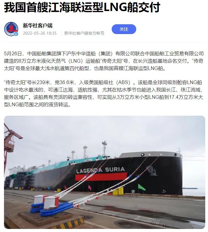 5月26日,中國(guó)船舶集團(tuán)旗下滬東中華聯(lián)合中船貿(mào)易建造的8萬立方米液化天然氣(LNG)運(yùn)輸船“傳奇太陽”號(hào)在長(zhǎng)興造船基地命名交付。“傳奇太陽”號(hào)是全球最大淺水航道第四代、我國(guó)首款首制首艘江海聯(lián)運(yùn)型LNG船,填補(bǔ)了中國(guó)淺水航道LNG船的空白,在該細(xì)分市場(chǎng)占有率最高,有望成為中國(guó)船舶制造的又一精品船型。