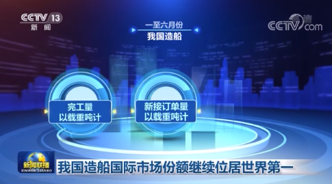7月17日,央視《新聞聯播》對我國造船國際市場份額繼續位居世界第一進行了報道。數據顯示,一至六月份,我國造船完工量、新接訂單量、手持訂單量,以載重噸計分別占世界總量的45.2%、50.8%和47.8%,國際市場份額繼續位居世界第一。