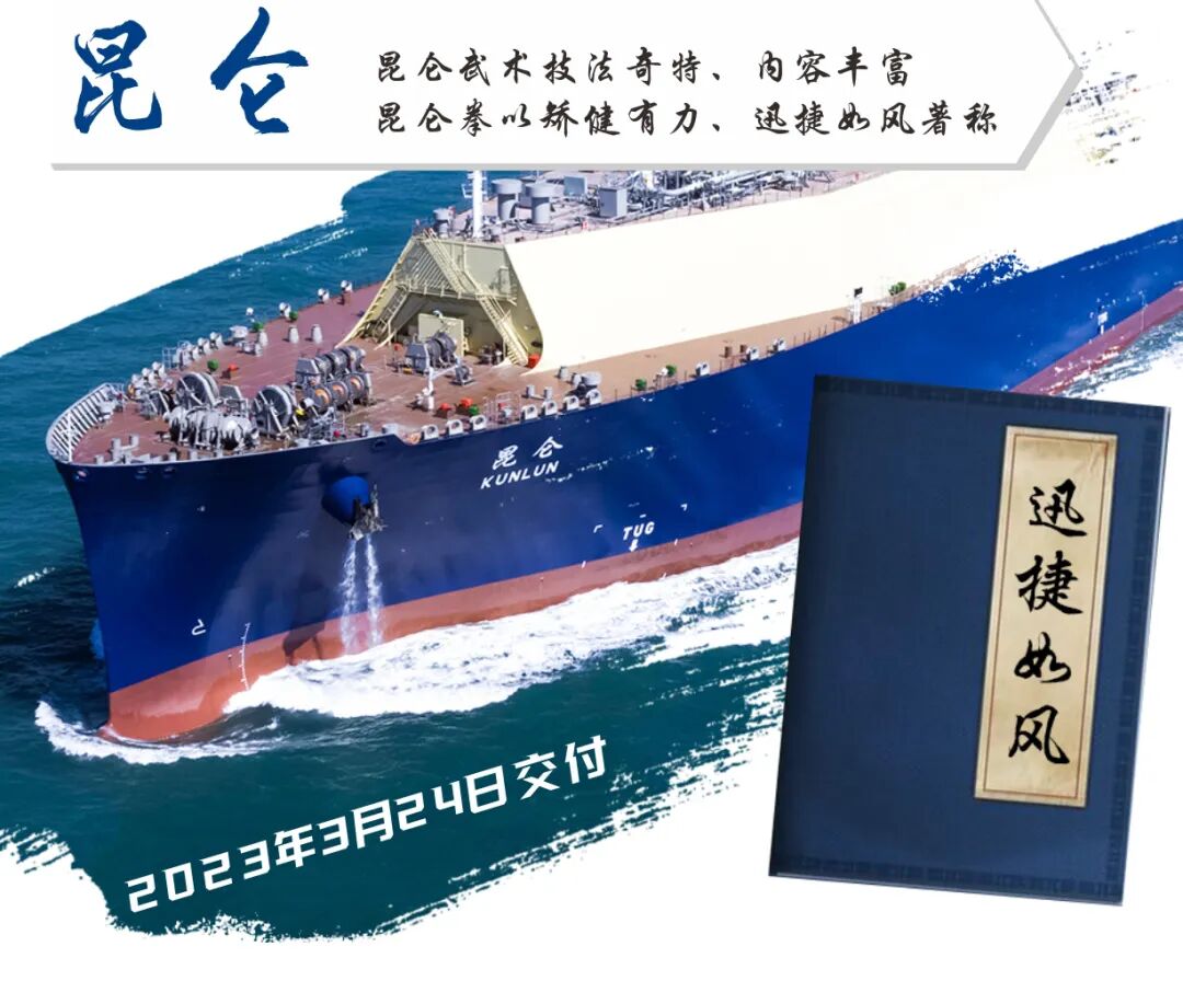 中遠海運中石油國事LNG運輸項目共簽約三期8艘 17.4萬方LNG船。之前,滬東中華已完成一期、二期項目——“少林”“武當”“昆侖”“峨眉”“華山”“崆峒”6艘LNG船均已交付。隨著“青城”號的命名交付,如今已經集齊了“七大門派”。快跟隨小新的步伐,一睹“武林爭霸”的風采!