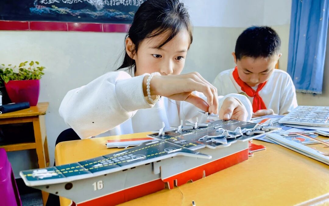 課堂特別設計趣味問答與互動實踐環節。問答環節,學生們踴躍舉手搶答、主動提問;船模組裝實踐環節,志愿者手把手指導學生對照圖紙拼接零件,當一個個船模成型時,孩子們臉上滿是收獲的喜悅,不僅直觀掌握船舶構造原理,更在動手過程中筑牢國防意識。此次志愿服務播下的“深藍種子”,或許將在未來生根發芽一一有人可能成為海軍戰士、有人或許成為工程師……我們志愿路,也將沿著瀾滄江脈絡,延伸向更遠的遠方。
